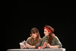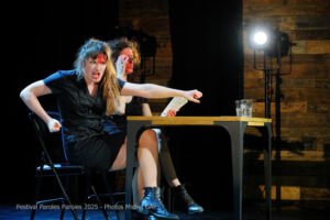 Les deux conférencières ensanglantées, telle des spectres des femmes assassinées, semblent revivre jour après jour cette conférence, mettant des mots sur l’attitude de leur bourreau pour mieux lui rire au visage.